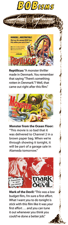 Bob once remarked, "We kicked off this show with Horror of Party Beach, and we knew we had our work cut out for us that night . . . and it seems it's been that way every Saturday night."