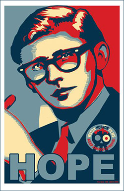 At The Montclair Presbyterian Church we met John Stanley and his wife Erica in the nearby parking lot. John asked what's a good looking gal like Sara doing in a place like this. John also joked that the rafters would start creaking once I entered the church. I assured John that this was a heathen proof building. I had an armload of the Bob Wilkins "Hope" posters that I signed in silver and gave to John, Sally Wilkins, Rob Wilkins, August Ragone, Scott Moon, Bob Johnson, Bob Beavon, some of Bob's close family members and fans, Tom Wyrsch, and Ernie Fosselius, who I had emailed the design the night before. Ernie made it into 10pin-back buttons that he handed out to the Wilkins inner circle--though I ended up giving mine away to a fan.